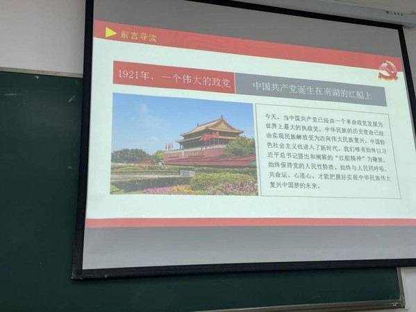 今天的会议,主持人先给大家介绍了1921年8月初,中国共产党第一次全国代表大会在浙江嘉兴南湖的一条游船上胜利闭幕,宣告中国共产党的诞生。这条游船因此获得了一个永载中国革命史册的名字——红船。