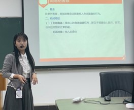 最后,法学的胡越老师压轴带来故意伤害罪的磨课讲授。她从实际案例入手,引导学生们逐步理解故意伤害罪的相关法律条文和实际应用。胡老师的讲授感染力十足,声音随着讲授的示例有所起伏,牢牢抓住了在场同事们的注意力。通过逻辑清晰和生动的讲授,让理论知识深入浅出、便于理解。点评环节中,她的讲课得到了督导王教授的高度评价。