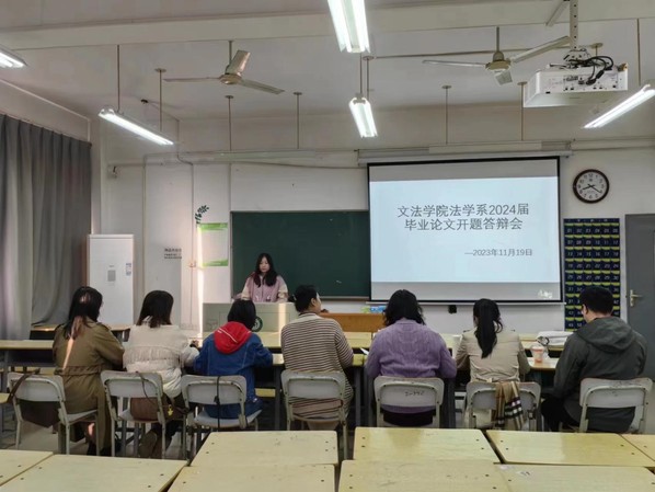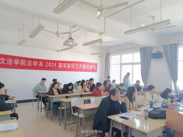 2023年11月19日,文法学院法学系顺利召开2024届毕业论文开题答辩会。会议由法学系主任张威老师主持,副院长华丽娜副教授、法学系全体老师及2024届毕业生参加。
