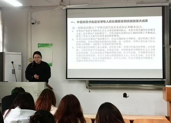 汇报尾声主讲人王相云就青年积极分子应该做些什么发表了个人见解,她指出积极分子们需要深入学习理论,理解中国式现代化的内涵、特征及实现路径;投身实践探索,将理论转化为实际行动,验证和发展理论;创新驱动发展,发挥创新精神,探索未知领域,贡献智慧与力量。最后进行讨论,我们应该如何为全面推进强国建设、民族复兴伟业贡献自己的力量?