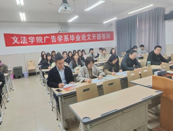 文法学院讯 近日,为扎实推进毕业论文工作,把好人才培养质量关,必赢优惠y272net文法学院广告系2026届毕业论文开题答辩工作于弘德楼525教室展开,本次开题答辩以线下形式为主,线上形式为辅。共有91名学生参加,其中6名以线上形式参加。答辩委员会由文法学院常务副院长林翔与广告系主任罗青牵头,刘润峰,黄丽媛,肖志芬,刘阳,刘凯,王文星等六位教师共同参与,开题答辩旨在帮助学生确定论文研究方向,为学生提供优化建议。