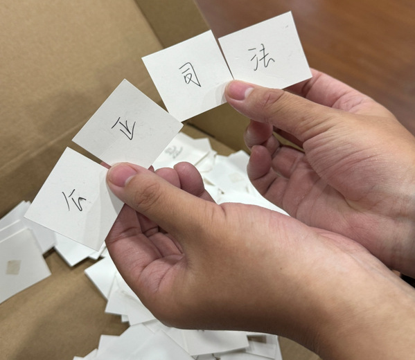 活动伊始,主持人任斯羽对到场人员表示热烈欢迎,随后宣布进入第一个环节——“汉字为骨,法律为魂”,寻找字卡,组成法律成语,如正当防卫、罪刑法定等。同学们热情高涨,积极寻找隐藏在教室角落的字卡,在汉字迷宫中抽丝剥茧,思考并拼凑成一个个法律成语,完成与法律知识相结合的趣味游戏。