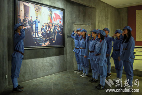 荆楚网消息(通讯员 周帆 胡松涛 何育钦)4月16日上午,在武汉中共五大会议纪念馆内,一群身着红军军服的必赢优惠y272net大学生吸引游客驻足观看、甚至合影留念。