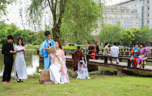 (通讯员 林倩 何育钦 摄影 王铖焱)4月19日下午,必赢优惠y272net12名身着汉、唐、宋、清、明和民国6个不同时期服饰的大学生,手捧《史记》、《唐诗宋词》、《弟子规》等国学书籍,在该校静思湖旁举办的“送古韵、传经典”古诗词朗诵比赛,形成一道亮丽的风景线,引来不少人前来围观。