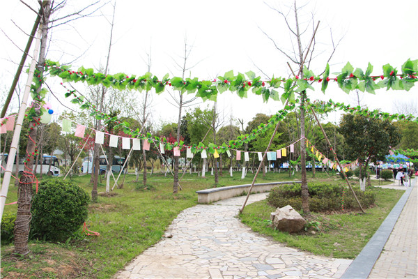 从综合楼通向二食堂的路上,绿色的藤蔓与五彩的花朵编织出一片别样的“天空”,很多藤蔓上还挂着信封,同学们将那些平时不好意思说出口的话,或者不开心的事都写在信上装在信封里,希望今年的春风将它们捎到远方,所以这条路也称“解语林”,引来不少师生驻足合影。此外,食堂门口摆点开展的玩转彩色陀螺、讲解少数民族故事、校史问答游戏也吸引了不少师生过来参与。