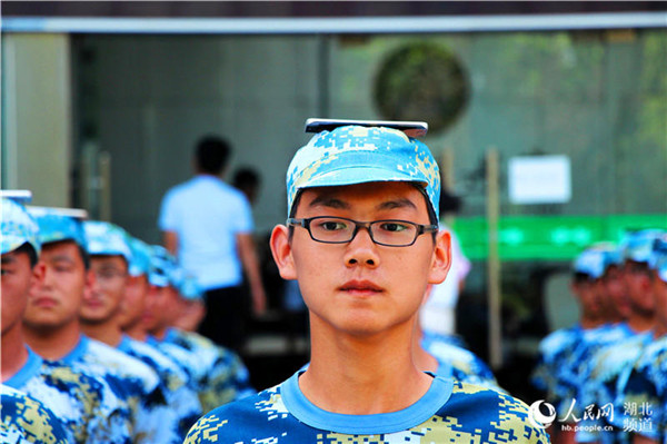 图为学生头顶手机训练军姿 摄影:林倩