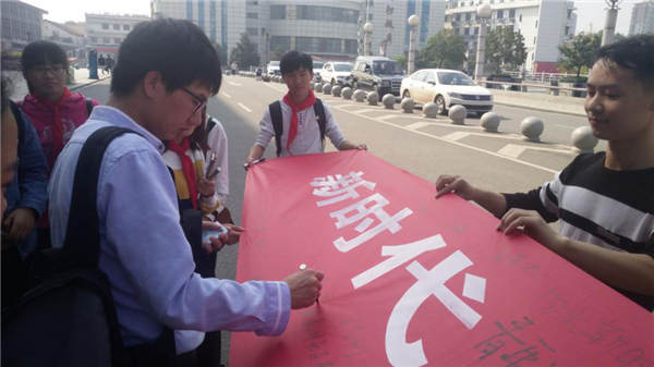早上8:30,物流学院学生党支部成员一行15人早早地在武昌火车站站前广场拉开了写有“新时代,为你打call”字样的横幅,引得周围的人投来好奇的目光。路过的人们纷纷在横幅上写下“中国加油!”等诸多对党和国家美好祝福的寄语。