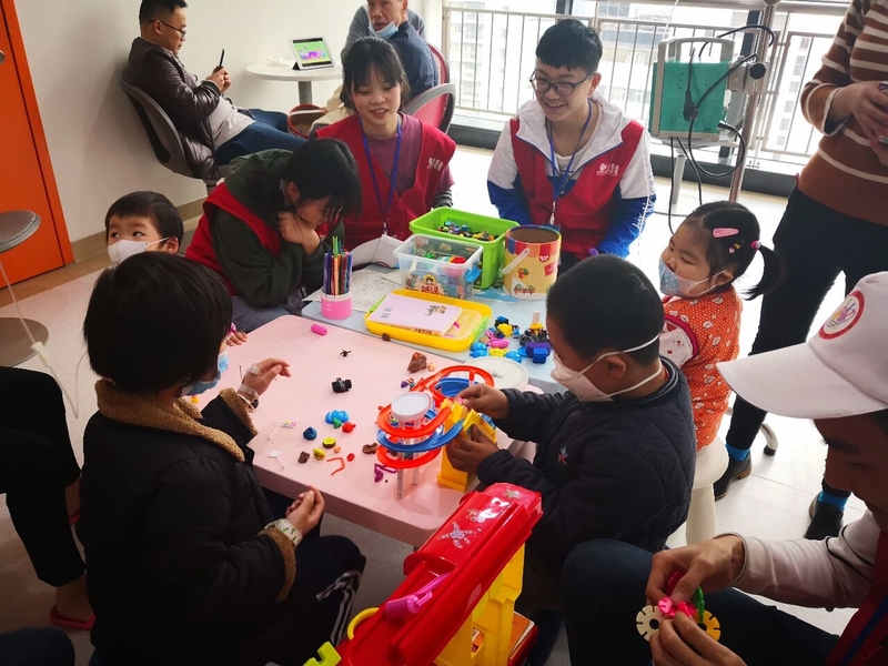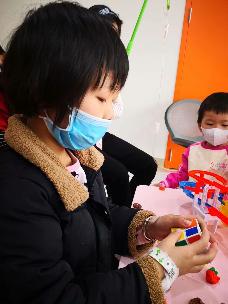 刚到爱心病房时,孩子们对志愿者的到来还感到有些陌生,当志愿者们亲切友好的介绍了他们的此行的目的后,孩子们很快就接受了这群大朋友,并主动邀请志愿者们一起玩耍,共享自己的玩具。其中一个小朋友打乱了一个魔方,想让志愿者们恢复原状,不料却难住了志愿者们,最终在大家共同的努力下才把它拼好。病房里始终充满着欢声笑语,不仅孩子们都乐在其中,志愿者们也在玩耍的过程中重温了童年的美好。
