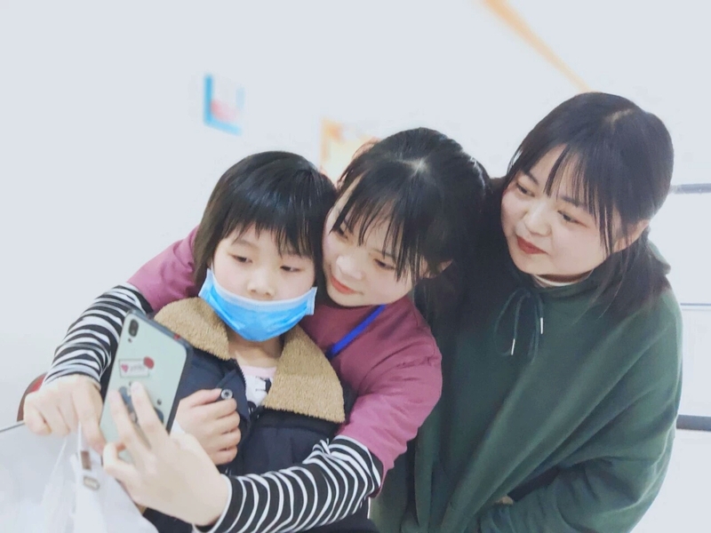 图为小朋友和志愿者在自拍