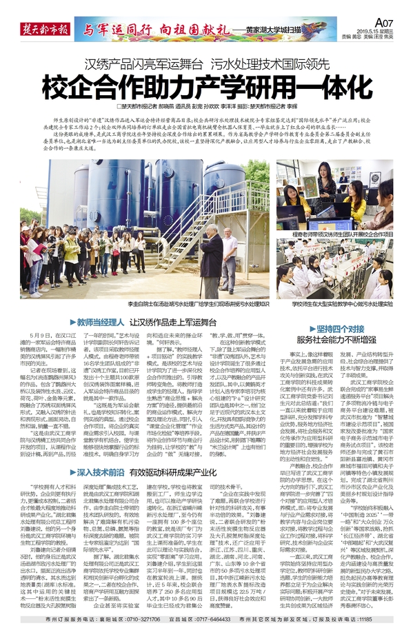 师生原创设计的“非遗”汉绣作品进入军运会特许经营商品目录;校企共研污水处理技术被院士专家组鉴定达到“国际领先水平”并广泛应用;校企共建院士专家工作站2个;校企双师共同培养的订单班走出全国首批电商机械臂仓机器人保育员、一毕业就当上了红豆公司的职业店长……