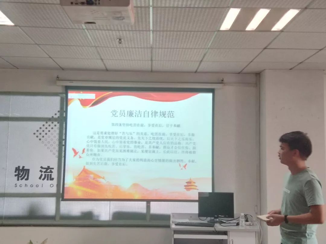 随后,学生党员苟长江和黄力力分别以个人经历和案例分析为大家进一步解析了党员廉洁自律准则的内涵。并号召同学们要严于律己,争做新时代合格党员。
