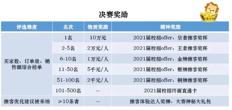 为鼓励更多大学生报名参赛,并表彰大赛中表现优异的选手,比赛设立了丰富、诱人的各类奖励,包括:最高 10 万元创业奖金、2021 届校招 offer、2021 届校招终面直通卡、暑期实习证明、参赛证书、奖杯、奖牌、各类大礼包等,具体如下: