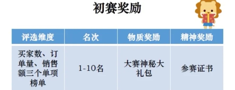5月26日比赛正式开始,选手可实时查看自己的推广数据,每周大赛组委会会发布买家数、订单量、销售额三个单项的过程榜单,6月30日将根据累计推广数据发布初赛最终榜单。