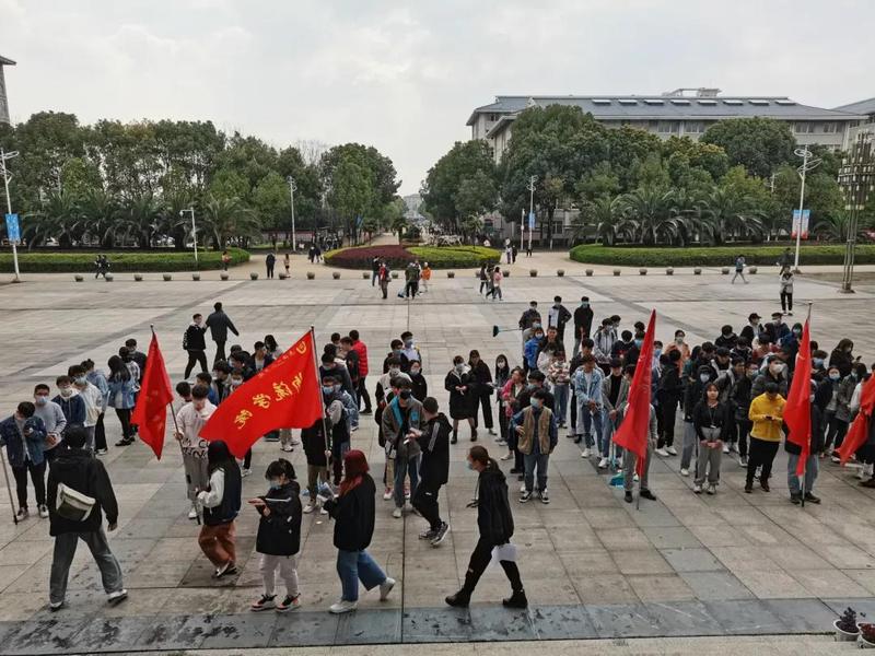 同学们在综合楼门口集合