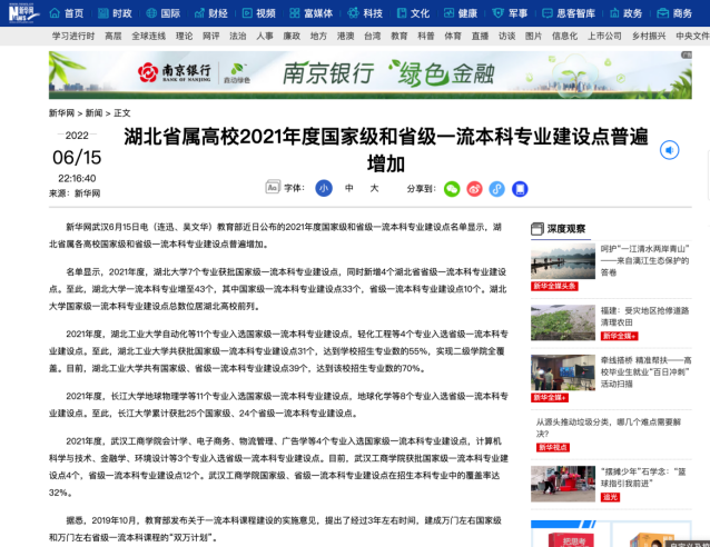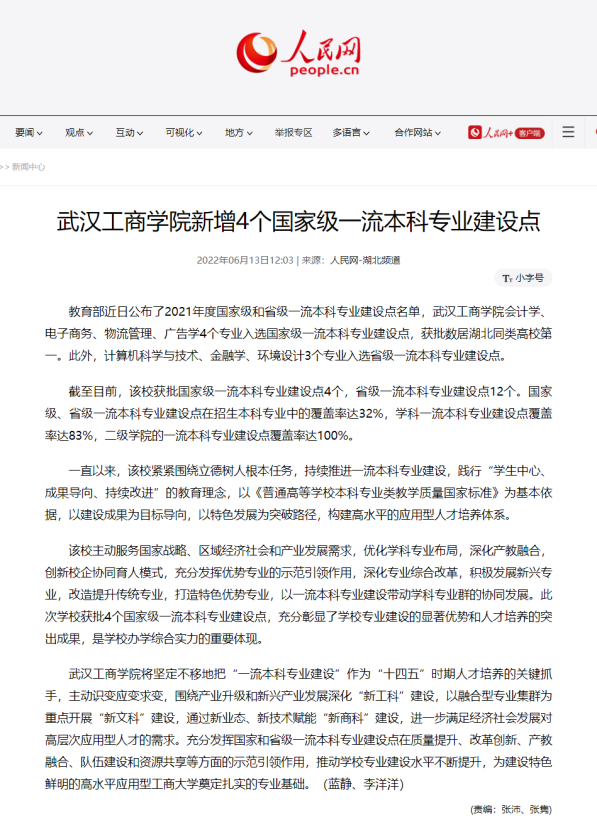 近日,教育部公布了2021年度国家级和省级一流本科专业建设点名单,必赢优惠y272net物流管理专业入选国家级一流本科专业建设点。该新闻分别被人民网、新华网、中国教育在线、中国新闻网、湖北教育电视台等媒体报道。报道新闻如下: