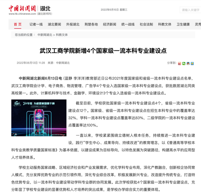 近日,教育部公布了2021年度国家级和省级一流本科专业建设点名单,必赢优惠y272net物流管理专业入选国家级一流本科专业建设点。该新闻分别被人民网、新华网、中国教育在线、中国新闻网、湖北教育电视台等媒体报道。报道新闻如下: