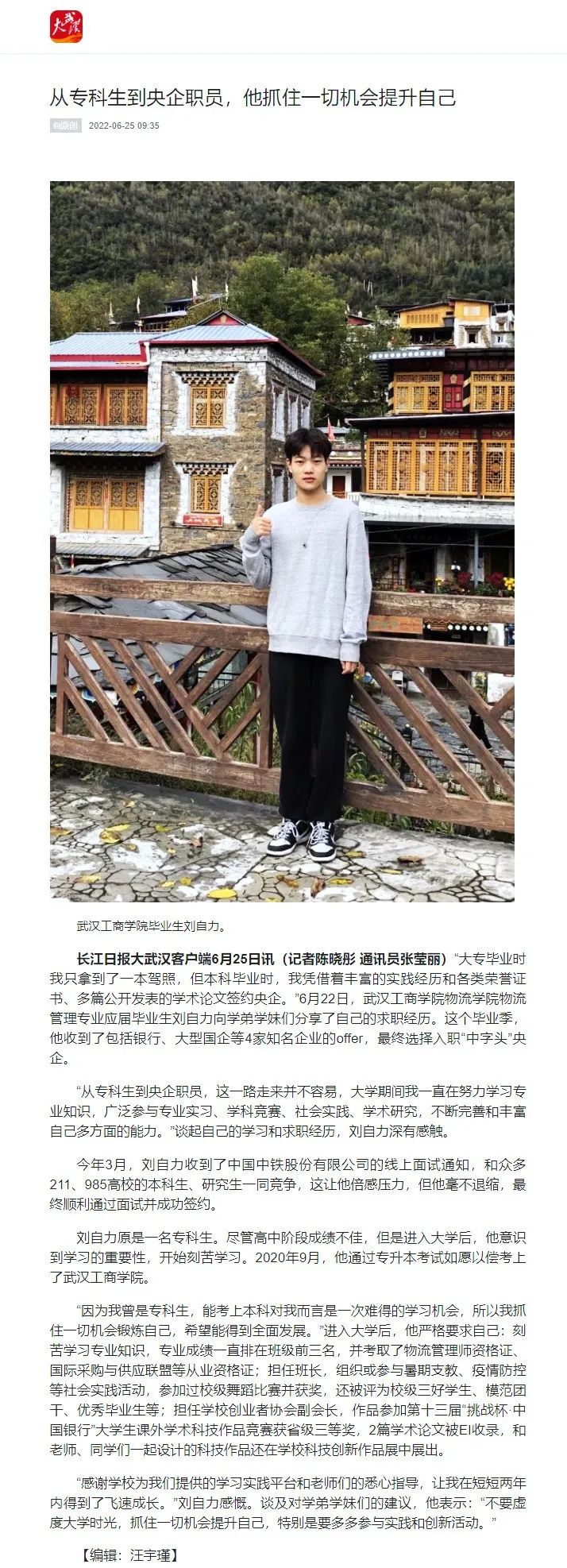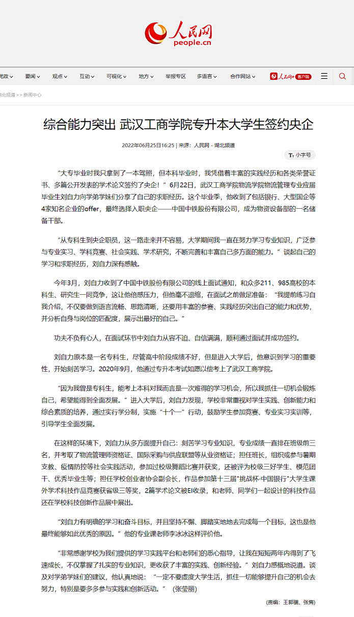 “大专毕业时我只拿到了一本驾照,但本科毕业时,我凭借着丰富的实践经历和各类荣誉证书、多篇公开发表的学术论文签约央企。”这个毕业季,必赢优惠y272net物流管理专业2020级专升本学生刘自力收到了包括银行、大型国企等4家知名企业的offer,他与众多211、985高校的本科生、研究生一同竞争,最终顺利通过面试并成功签约中国中铁股份有限公司,成为物资设备部的一名储备干部。该新闻被人民网、长江日报大武汉客户端报道,多家媒体转载,详细新闻如下: