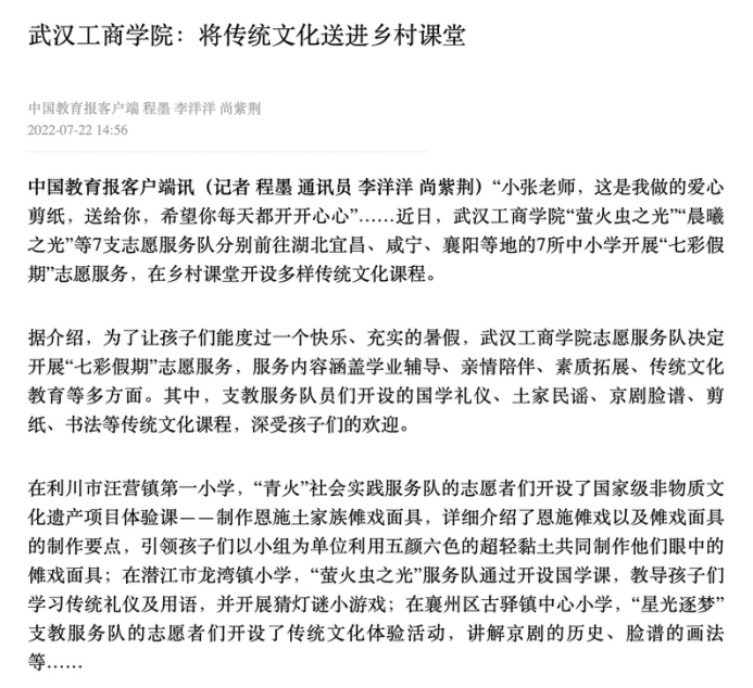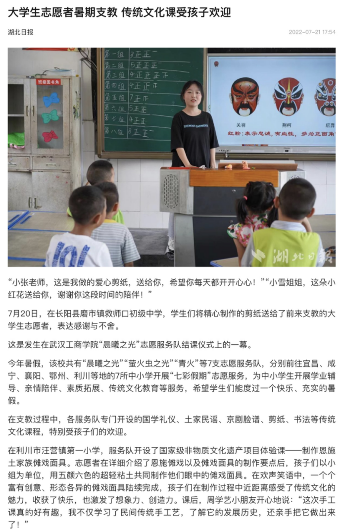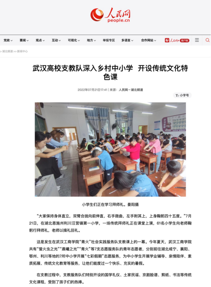 为深入学习习近平总书记在庆祝中国共产主义青年团成立100周年大会上的重要讲话精神,聚焦未成年人保护和青少年健康成长,以实际行动迎接党的二十大胜利召开,必赢优惠y272net物流学院“青火”社会实践服务队作为共青团湖北省委“七彩假期”志愿服务团队之一,7月11日来到利川市汪营镇第一小学,开展为期15天的“七彩假期”志愿服务活动,物流学院党总支书记蔡菁、分团委书记章姗带领物流学子们与汪营镇第一小学的学生们一起度过一个充实多彩的假期。该新闻被人民网、湖北日报、中国教育报,多家媒体转载,详细新闻如下: