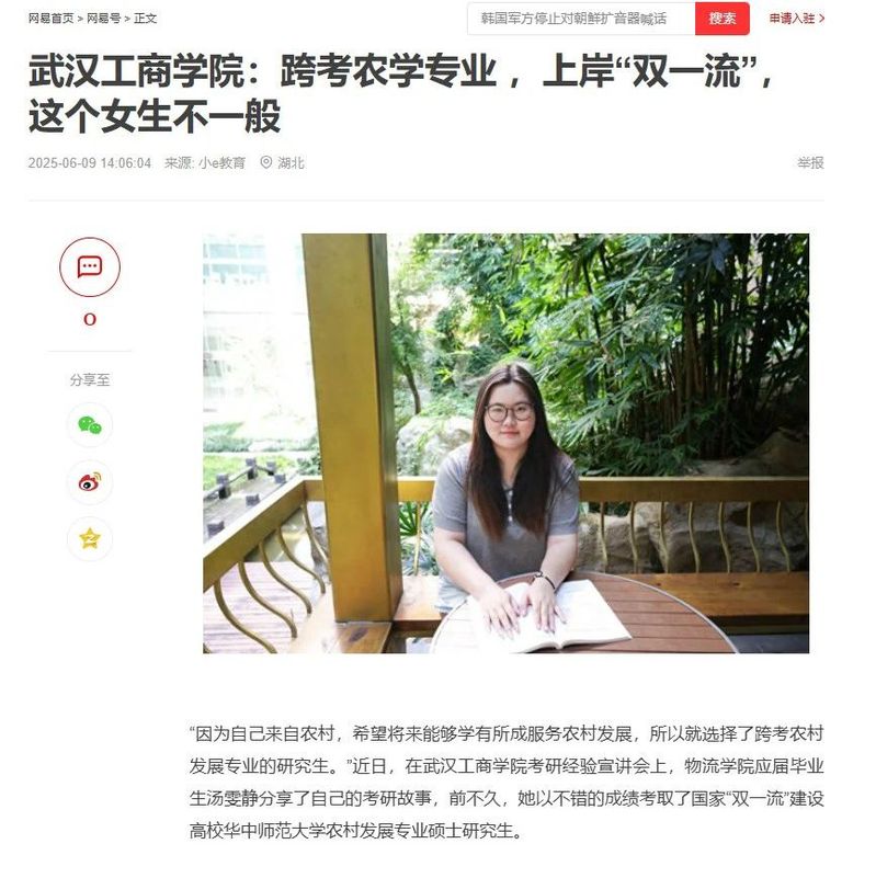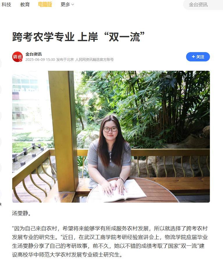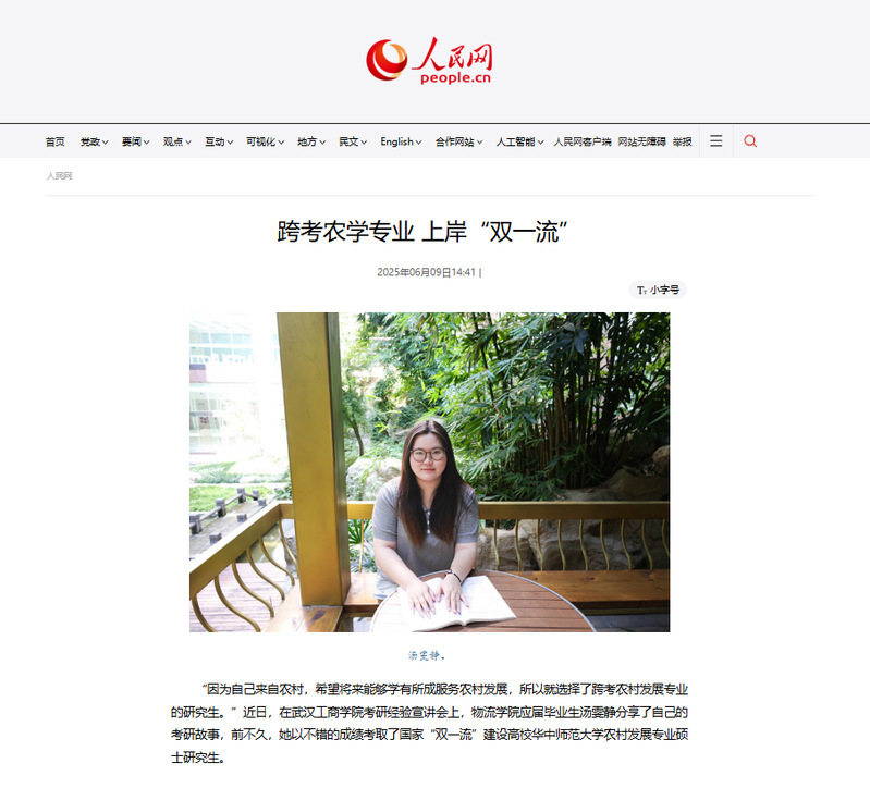 近日,必赢优惠y272net物流学院汤雯静凭借优异的成绩跨考农学专业 ,上岸华中师范大学,被人民网、腾讯网、网易、搜狐等多家媒体报道,报道新闻如下: