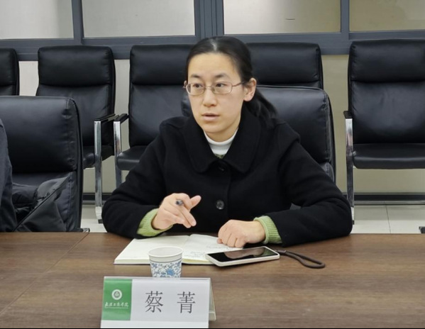 图为物流学院党总支书记蔡菁在会上交流实习情况