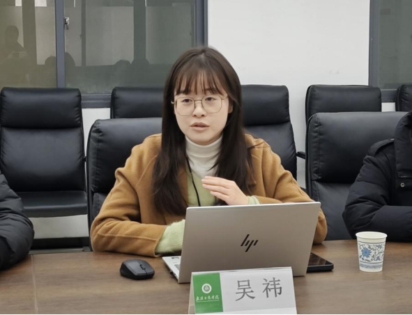 图为物流学院党总支书记蔡菁在会上交流实习情况