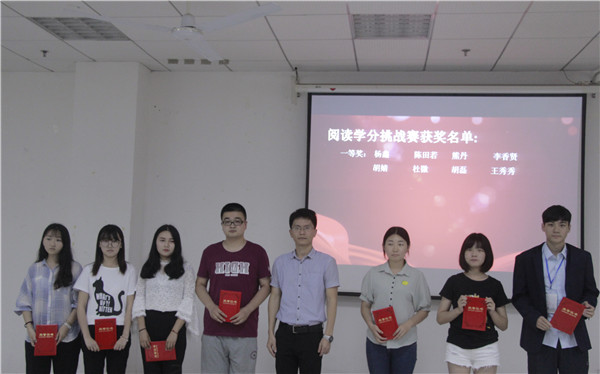 随后,大会表彰了在2017年阅读学分挑战赛奖、读书笔记竞赛中获奖的同学,卢炎生副校长等领导为获奖者颁奖。8位同学荣获阅读学分挑战赛一等奖,2位学生荣获读书笔记竞赛一等奖。