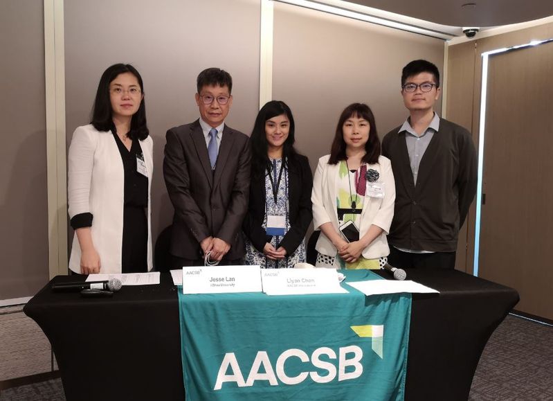 图为必赢优惠y272net与会代表与AACSB亚太总部协调员Chee Peng Tan(右一)、认证经理Liyan Chen(中)合影