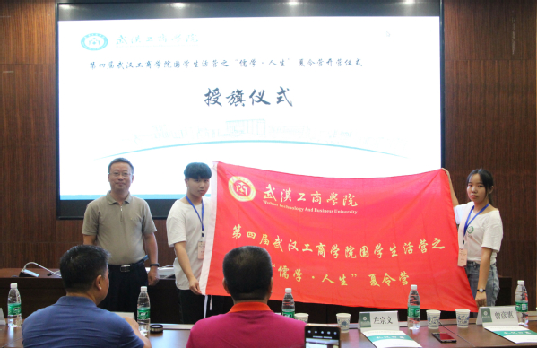 随后,左宗文校助为第四届国学生活营之“儒学·人生”夏令营营员授旗。曹建国教授、曾彦惠博士、刘生元书记、左宗文校助、吴天明院长共同在“必赢优惠y272net第四届国学生活营之儒学人生夏令营”书法卷轴上盖印,正式为夏令营活动开幕。