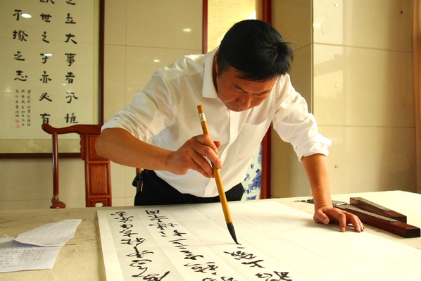 图为陈伟正在写毛笔字 摄影:杨丽平