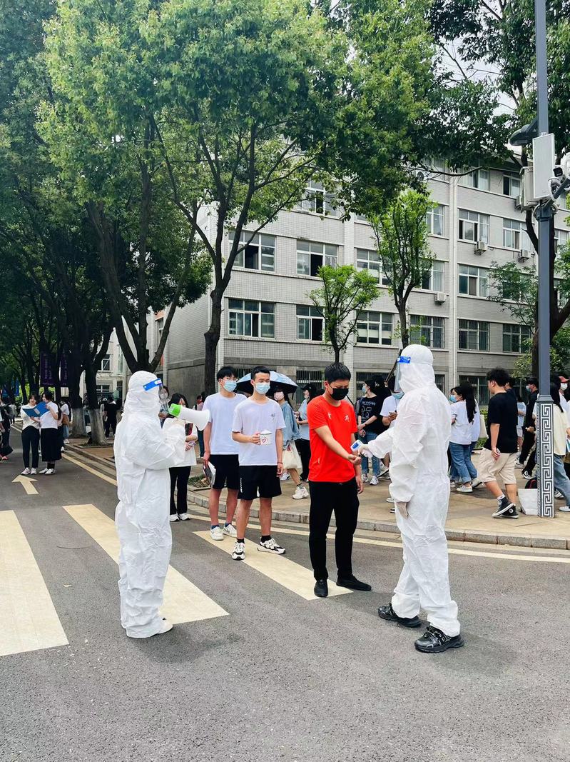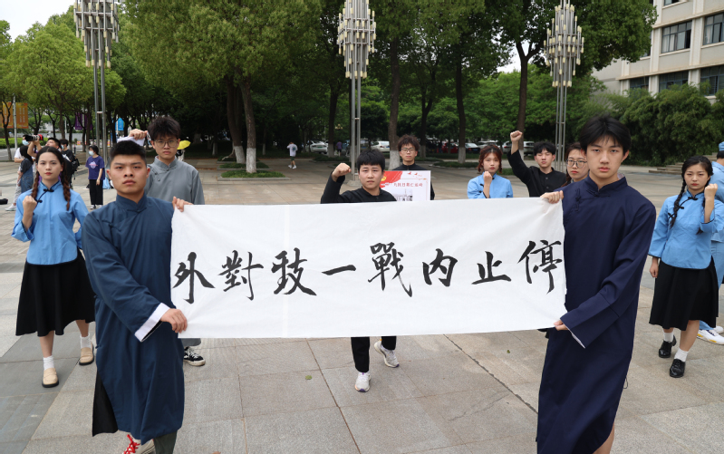 快闪现场,身着民国青年服装的学生们演绎“五四”爱国运动的情景,致敬和弘扬先辈们的爱国精神;团旗前,学生们庄严宣誓;身穿防护服的青年志愿者,正在开展测温等防疫志愿服务……