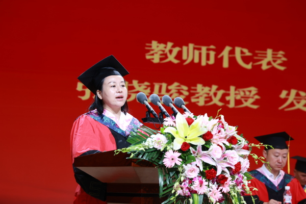 经济与商务外语学院院长张晓骏教授作为教师代表发言。她真诚地寄语毕业生:“希望你们能够保持谦逊,从零开始,虚心学习,树立终生学习的理念;希望你们能够树立远大理想,脚踏实地,不懈奋斗,将人生的梦想汇入时代的洪流,将个人的追求与国家和民族的命运紧密相连;希望你们永远保持乐观的心态和坚韧的性格,在未来的航程中乘风破浪、勇往直前。”