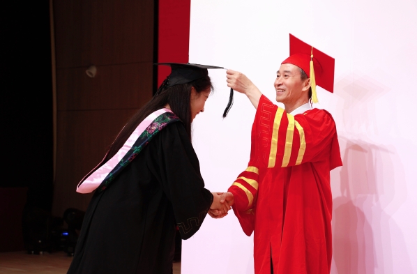 图为孔建益校长为学生拨穗 摄影:胡毅