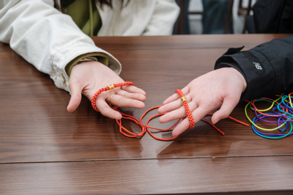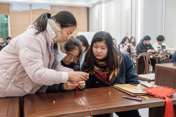 李丹丹老师深入讲解了中国结的历史渊源、寓意和文化内涵,并现场展示了中国结的编织手法,通过一步一步的分解动作指导大家如何将中国结绕绳、打结、打穗等,只见一根红绳在她手中穿梭缠绕,最终变幻出了精美的结式。同学们现场学得十分认真专注,纷纷按照李老师的所讲步骤实操起来,很快一条条精美的手绳便出现在大家的手上。