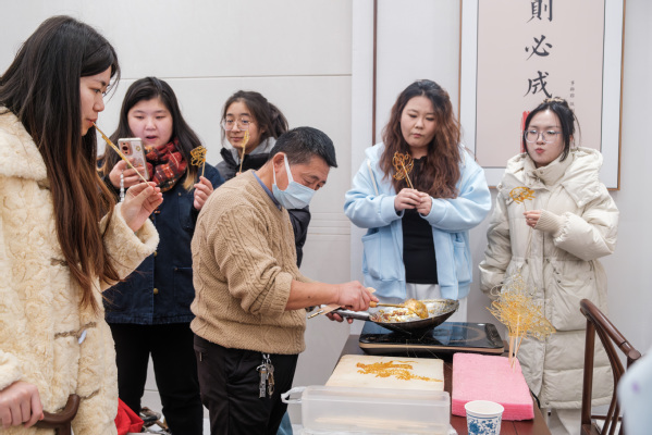 “有趣又好玩!这次的非遗实践课程太有意义了,让我对中国传统文化有了更加直观且深刻的认识和理解,并且能够与非遗大师面对面,近距离亲身体验中华优秀传统技艺,这种感觉真的太棒了!” 该校法学专业的大二学生何思颖一手拿着中国结一手拿着糖画,开心地向记者展示了她的“得意之作”。