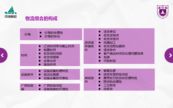 李敬泉执行董事指出无车承运人能作为一种物流服务商品存在的原因是因为这种服务具有实体商品的属性。并且物流服务并不仅仅是由某一环节的物流服务提供商所创造,而是物流渠道多方参与者共同完成从而使消费者获得美好的购物体验。李敬泉执行董事首次提出物流组合的概念,物流组合指不同物流服务的产出物以及围绕这些产出物的产出条件而形成的要素组合。物流组合主要由六个方面构成,如下图所示。