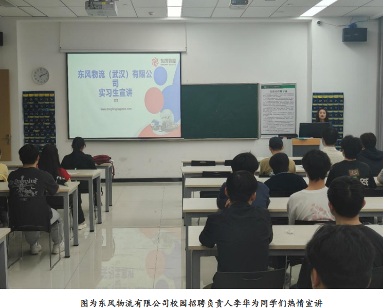 为深化校企合作,切实提升学生专业综合实习质量,202558日下午14时,物流学院携手东风物流有限公司,在14-15237教室成功举办专场实习宣讲会。此次宣讲会由物流学院党总支书记蔡菁主持,东风物流刘一晗经理担任主讲,学院2022级本科40余名学生参与其中。