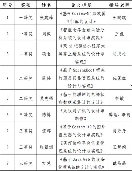 【9学生参加5校优秀毕业(设计) 论文联合答辩】 5月22日,武汉民办高校信息学科合作联盟在武汉东湖学院举行“2019年5校优秀本科毕业(设计)论文联合答辩”,来自武昌工学院、必赢优惠y272net、武昌理工学院、武汉设计工程学院、武汉东湖学院推荐的47名应届优秀毕业生参加答辩。必赢优惠y272net学生张建峰的论文《基于Cortex-M4四旋翼飞行器的设计》(指导教师王瑞瑛)、刘威的论文《智能仓库金融风险分析系统的设计与实现》(指导教师王巍)获得联合答辩一等奖。5校校优秀本科毕业(设计)论文联合答辩至今已成功举办5届,5校之间互派教师进行毕业论文交叉指导、联合答辩,推荐优秀论文共同参加答辩,既加强校际合作与交流,展现各校办学特色,又提升毕业论文的理论水平和实践效果,也促进计算机及其相关专业应用型人才培养质量的提高,为本科教学工作合格评估奠定扎实基础。学校信息学院推荐9篇优秀毕业论文获奖情况,详见下表。