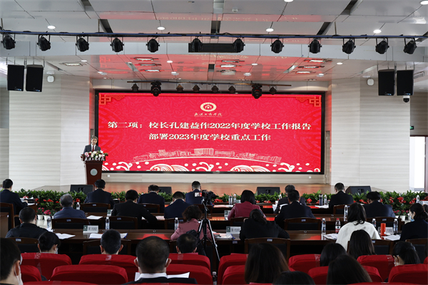 “2022年,是党的二十大胜利召开之年,是学校全面推进高质量发展的关键之年,也是学校建校20周年的校庆之年。一年来,全校上下紧扣‘十四五’发展目标,围绕本科教育教学审核评估基本要求,深化武工商命运共同体理念,抢抓机遇、攻坚克难,各项工作不断取得新突破。”孔建益校长代表学校向大会做了主题为《凝心聚力共谋发展 务实笃行再创辉煌》的工作报告,全面回顾总结学校2022年的工作,部署2023年的主要工作。他指出,2022年,在校董事会的领导下,全校师生干事创业热情持续高涨,取得了不少标志性办学成效;学校全面加强党的领导,落实立德树人根本任务;全面优化治理体系,充分激发办学活力;坚持以学生为中心,全面提高人才培养质量;坚持以改善民生为重点,增强广大师生幸福感。