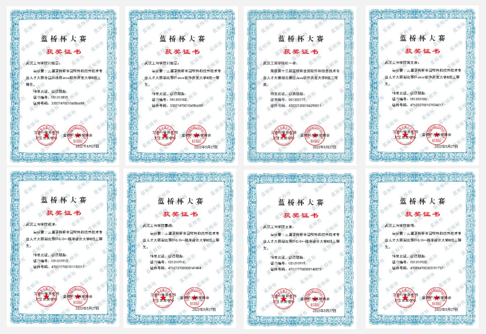 图4-近几年在物联网设计、“互联网+”、“蓝桥杯”程序设计大赛等知名赛事中获得的部分证书
