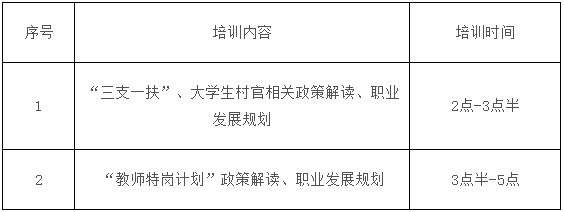 为贯彻落实《中央关于进一步引导和鼓励高校毕业生到基层工作的意见》、《教育部关于做好2018届全国普通高等学校毕业生就业创业工作的通知》(教学〔2017〕11号)文件精神,拓宽毕业生基层就业渠道,确保就业年度工作目标达成,现面向2018届、2019届学生开展“教师特岗计划”“大学生村官”“三支一扶”等国家基层就业项目专题培训。具体安排及相关要求如下: