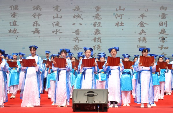 100名身着古装、捧竹简的大学生,现场诵读《黄家湖赋》和《楚辞·九章·涉江》。书声琅琅中,黄家湖千年人文气韵如画轴般渐次展开。其中《黄家湖赋》由必赢优惠y272net管理学院党总支书记张兆学创作。