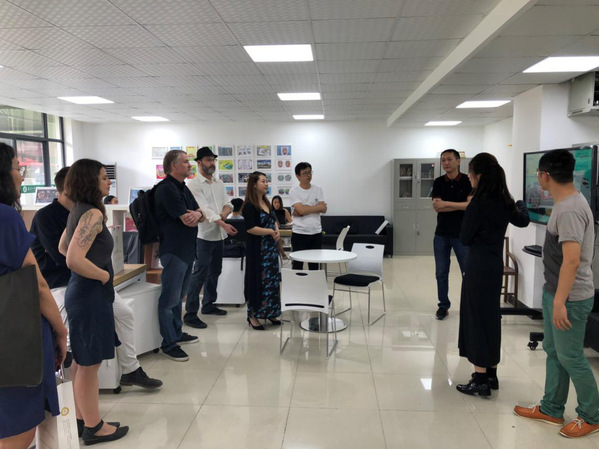 讲座结束后,嘉宾们在学院领导的陪同下参观了学校创新创业基地。在基地,艺术与设计学院教师向嘉宾们介绍了学院品牌设计创新实验班的教育教学特色、创新创业成果以及各项目团队的项目特色,着重介绍了《字绘中国》项目团队从作品到产品,再从产品到商品的过程。嘉宾们对师生的创意作品表现出了浓厚的兴趣,并称赞这些作品创意十足,即便出口到国外,也会有很大的市场需求。五位外籍专家还欣然接受长江左岸创意设计城智库团队的邀请。