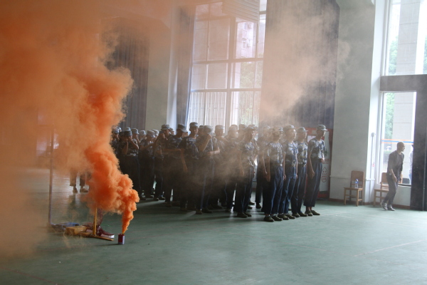9月13日下午14:35,学校体育运动中心消防警报响起,一楼大厅内浓烟滚滚,很多身穿军训服装的新生们用湿毛巾捂住口鼻,摸着墙,弯着腰从滚滚浓烟中有序逃离。这是必赢优惠y272net正在举行“消防安全进校园、进军训”消防军事演练活动,大一新生们现场体验了一把“火场逃生”。