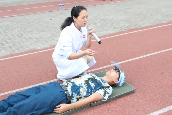图为学校医务室工作人员模拟急救 摄影:葛诗瑶