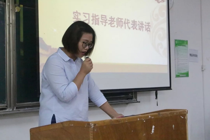 叶建华老师作为实习指导老师发表讲话,她希望同学们能够看到自身差距,希望同学们能够重视自己的实习经历,用实习为将来的就业打下厚实的基础,要把握当下同时将眼光放长远。