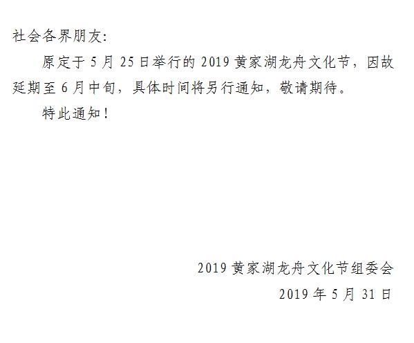 关于2019黄家湖龙舟节延期举行的通知
