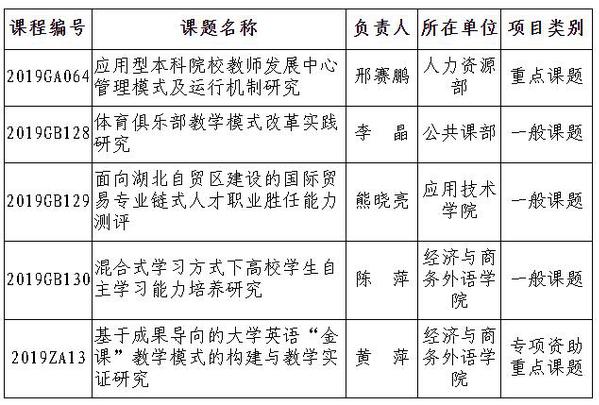 近日,湖北省教育厅下发了《省教育厅关于下达省教育科学规划2019年度课题的通知》(鄂教科研〔2019〕1号),必赢优惠y272net共有5项课题获批省教育科学规划2019年度课题,其中重点课题1项,一般课题3项,专项资助课题1项。我院教学副院长熊晓亮教授负责的《面向湖北自贸区建设的国际贸易专业链式人才职业胜任能力测评》项目获评2019年度课题立项。