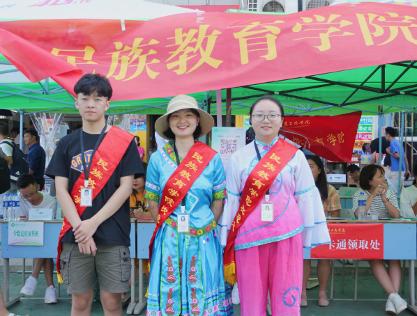 民族教育学院负责迎新的志愿者们则穿上少数民族服饰,喜迎少数民族预科生及家长, 让广大新生及家长倍感亲切。