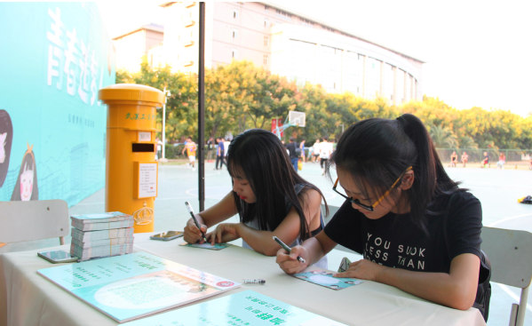 图为大一新生正在投递明信片 摄影:李洋洋