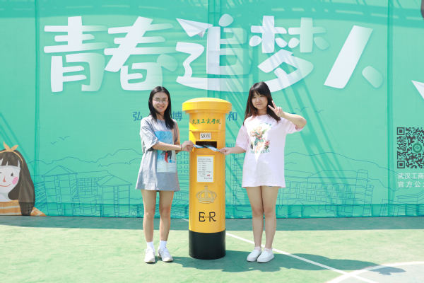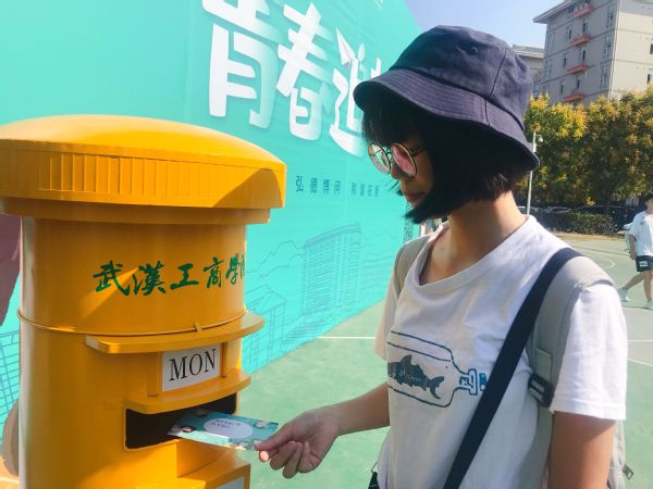 新生们纷纷把青春的梦想与期盼写在明信片上,并投入“未来站”邮筒里,希望明信片穿越时光“寄”给毕业时的自己。